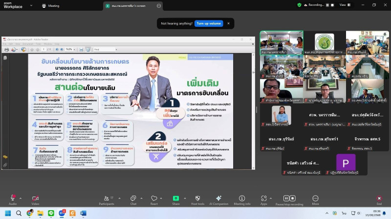 วันที่ 13 สิงหาคม 2568 นายอาทร ชัยยันต์ สหกรณ์จังหวัดนครราชสีมา ร่วมประชุมหน่วยงานในสังกัดกระทรวงเกษตรและสหกรณ์ โครงการที่จะดำเนินงานภายใต้นโยบายและแนวทางการดำเนินงานขับเคลื่อนภาคการเกษตร เรื่องการลดต้นทุนและเพิ่มผลผลิตภาคการเกษตร ผ่านระบบ (Zoom Meeting) โดยมีนายศรัญญู พูลลาภ ผู้ตรวจราชการกระทรวงเกษตรและสหกรณ์ เขตตรวจราชการที่ 13 เป็นประธานในการประชุม ณ ห้องประชุมสุรนารี สำนักงานสหกรณ์จังหวัดนครราชสีมา